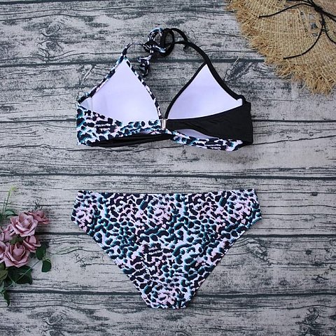 Раздельный купальник с анималистическим принтом и цветными пятнышками. Купальник выполнен из мягкого, быстро сохнущего полотна с принтом. Состоит из бюстгальтера и трусов. Бюстгальтер с формованными чашками без косточек. Обеспечивает комфортную, мягкую посадку. Бретели завязываются вокруг шеи. Застёжка сзади. Трусы средней посадки. В комплекте: лиф, плавки.
