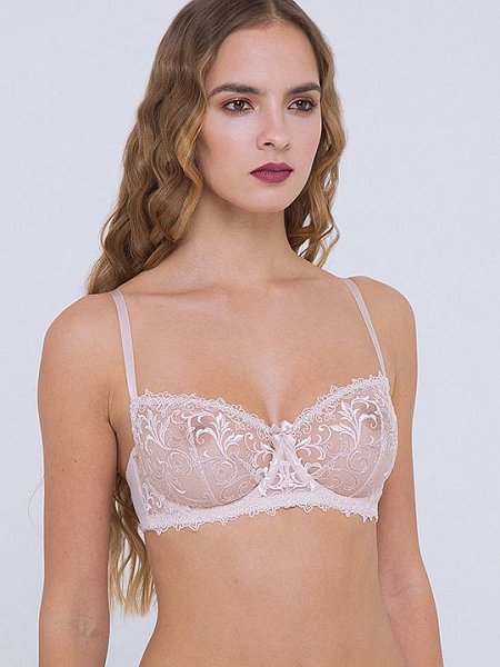 Модель с легкими, полупрозрачными чашками из изысканного шитья по ажурной сетке. Благодаря оригинальному крою чашек с двумя разнонаправленными вытачками бюстгальтер создаёт идеальную округлую форму груди.