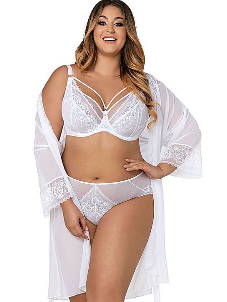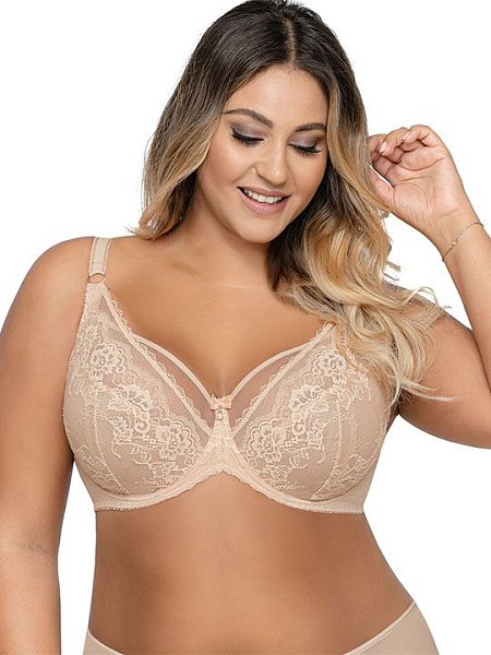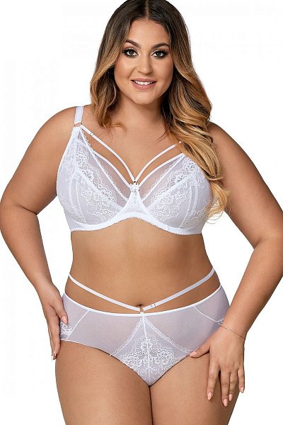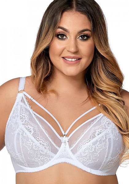 Бюстгальтер на косточках, чашки мягкие, шитые из сетки телесного цвета и чёрного кружева, бретельки не отстёгиваются, регулируются по длине, в зоне декольте несъёмные декоративные бретели. На спине застёжка на удлинитель, количество крючков в ряду увеличивается в зависимости от размера.