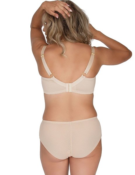 Бюстгальтер A-71 M выполнен на косточках, с боковыми поддержками, чашки мягкие, шитые из гипюра с цветочным рисунком, продублированы сеткой, верх чашек из сетки и кружева с «ресничками», спинка из плотной сетки. Бретельки не съемные, регулируются по длине, на спине застёжка - удлинитель на крючках, фурнитура металлическая цвета желтого золота.